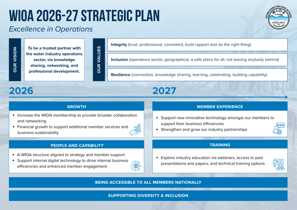 Today, boasting a robust membership exceeding 4,000 across the Country, WIOA is a dynamic hub for water industry professionals from all sectors, be it public or private. Our extensive range of members, spanning operations, management, engineering, and more, underscores our inclusive approach. We’re dedicated to elevating standards through supporting training and education, disseminating vital industry insights and retaining our workforce through engaging networking, social and educational events.